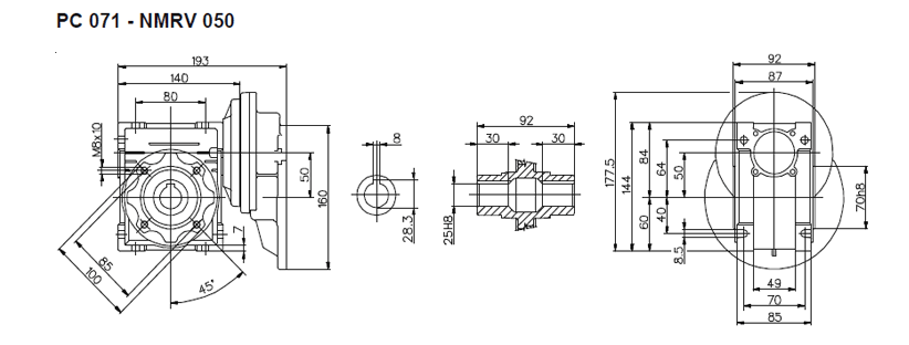 Цилиндро-червячный мотор-редуктор серии PCRV состоит из червячного редуктора NMRV и цилиндрической ступени PC. В отличии от редукторов NMRV цилиндрическая ступень имеет только одно значение передаточного отношения (3,5). Ступень PC поставляется в четырех типоразмерах: PC 63, PC71, PC80, PC90. Ступень устанавливается между электродвигателем и редуктором и позволяет получить диапазон передаточных чисел 75 – 320. Корпус из алюминиевого сплава. Шестерни выполнены из закаленного сплава 20MnCr5 (UNI7846).
